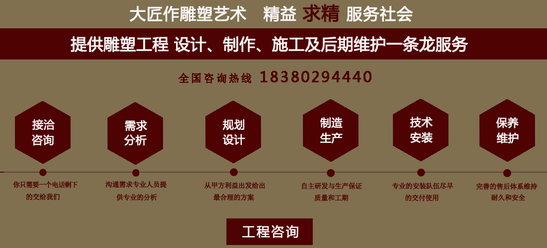 成都大匠作雕塑有限公司,是經(jīng)成都工商局審定注冊的正規(guī)專業(yè)雕塑制作及工程安裝服務(wù)機構(gòu),是由一群年輕富有朝氣的年輕人創(chuàng)辦,發(fā)軔于四川省成都市龍泉驛區(qū)。它是一家******于創(chuàng)作、制作和銷售為一體的公司。大匠作擁有多年從事公共藝術(shù)的專業(yè)人員和雕塑制作人組成的核心團隊,為您提供專業(yè)、具創(chuàng)新的設(shè)計及制作服務(wù)。公司成立以來,秉承“******服務(wù)、誠信為本”的宗旨,以客戶需求為目標(biāo)導(dǎo)向,不斷學(xué)習(xí),進取,優(yōu)化和提高服務(wù)質(zhì)量,公司向您******——“您的滿意***是我們的信譽”,我們將以飽滿的熱情和******的服務(wù)贏得您的贊譽和支持。 愛心,細(xì)心,耐心,責(zé)任心是我們的要求,盡心盡職,為您打造出創(chuàng)新、專業(yè)、******的設(shè)計方案,我們堅信先做人、后做事,用心對待客戶,實行透明收費,人性化服務(wù),本著對客戶負(fù)責(zé),對客戶負(fù)責(zé),更是對自己發(fā)展負(fù)責(zé)的態(tài)度,爭取做到讓每位客戶滿意